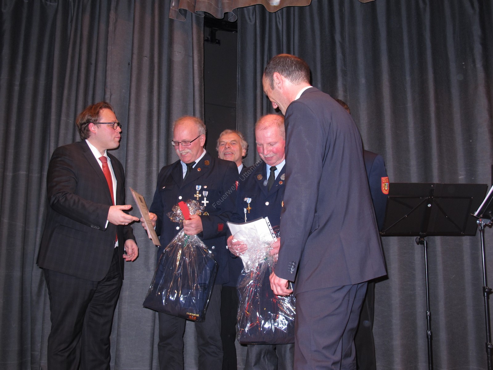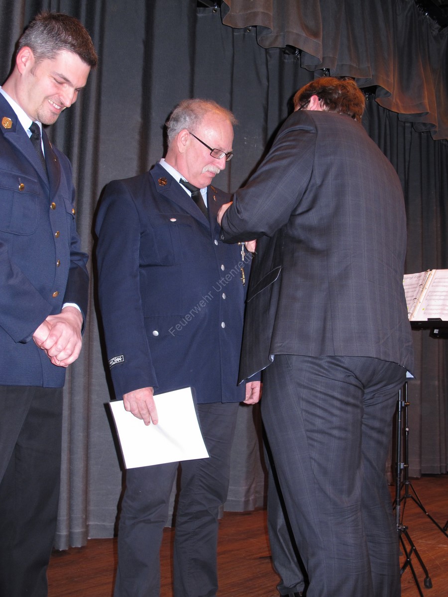 ...von Walter Baier und Helmut Horlamus im Beisein von Bürgermeister Frederic Ruth, Kreisbrandrat Matthias Rocca, Kreisbrandinspektor Heinz Horlamus sowie Kommandant und Kreisbrandmeister Klaus Funk vor. Für diese besondere Erhung wurde Ihnen das Feuerwehr-Ehrenzeichen in Gold verliehen. Die anwesenden Personen aus den Uttenreuther Vereinen, aus Politik und Öffentlichkeit applaudierten den Beiden.
