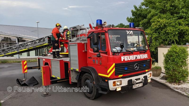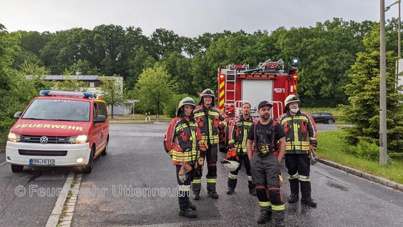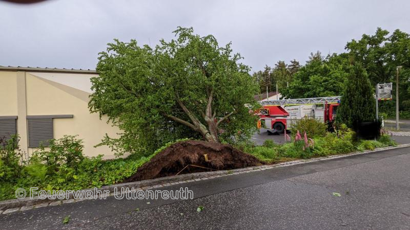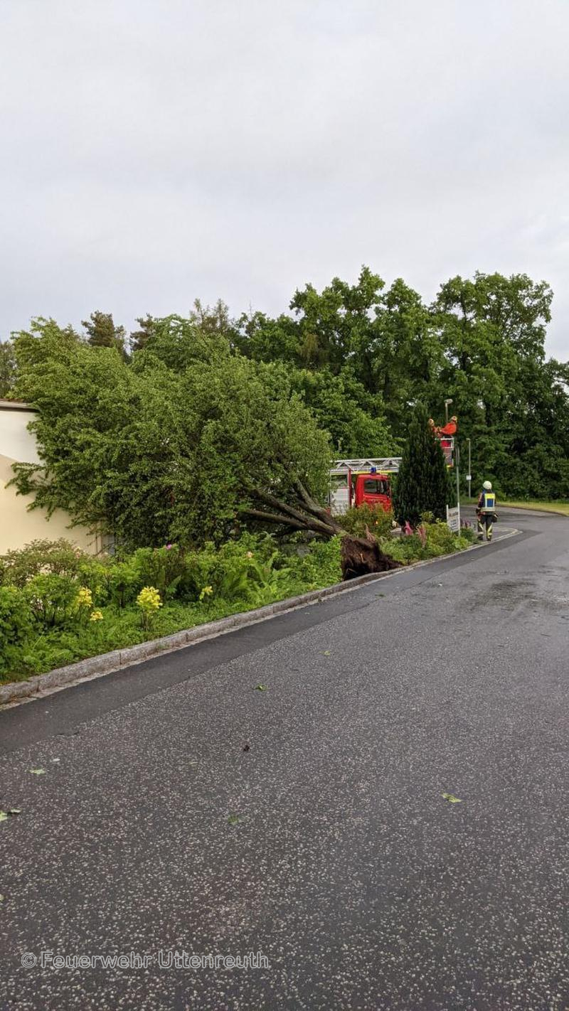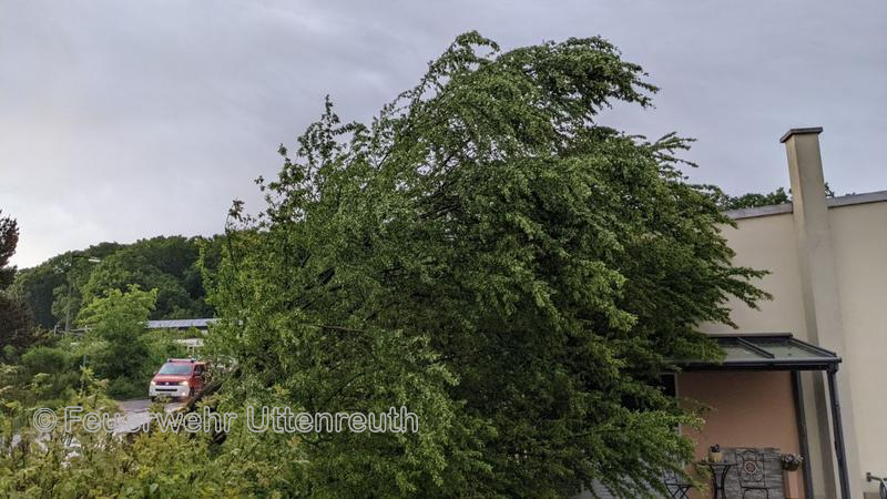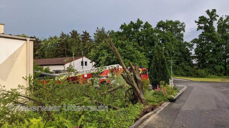 Ein Baum auf Gebäude gestürzt. Baum über DLK mit Kettensäge abgetragen.