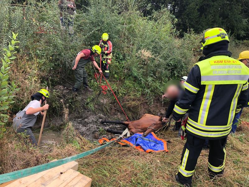 Beim Eintreffen an der Einsatzstelle kümmerten sich bereits Pferdehalter und Personal des Pferdehofs um das eingesunkene Tier und beruhigen es. Das Wasser des Baches umspühlte das Pferd und kühlte seine Temperatur herunter.